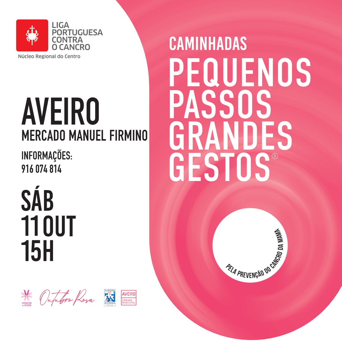A 15.ª edição das caminhadas Pequenos Passos, Grandes Gestos® realiza-se a 11 de outubro, às 15h00, em várias Cidades, incluindo em Aveiro. A partida será feita no largo do Mercado Manuel Firmino e a ação conta com o apoio da Câmara Municipal de Aveiro.