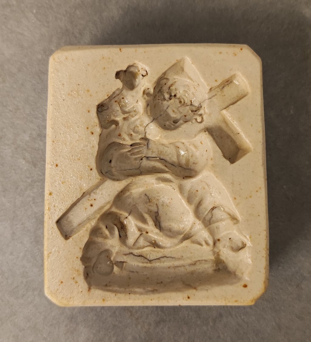 A peça, cedida por empréstimo temporário, é um raro molde conventual representando esta invocação do Menino Jesus dos Atribulados, proveniente do convento de S. João Evangelista de Aveiro, de religiosas Carmelitas, e situável entre os séc.s XVIII/XIX. Baseado numa gravura anónima que tem inscrito: O VERDADEIRO RETRATO DO MENINO JESUS DOS ATRIBULADOS, Que se venera na Igreja das Relig.ªs Trinas do Mocambo, convento da Ordem Hospitalar da Santíssima Trindade do Resgate dos Cativos (Lisboa), este molde destaca-se pelo rigor e preciosismo da sua execução e pela matéria usada, não o barro vermelho mas usando eventualmente mullite (mineral associado à porcelana, altamente resistente), pelo que tem uma coloração esbranquiçada. Estes moldes conventuais serviam para a realização de pequenas figurinhas devocionais que muitas vezes eram vendidas nas rodas conventuais, permitindo às religiosas não só a satisfação devota mas também a possibilidade de criarem algum rendimento.