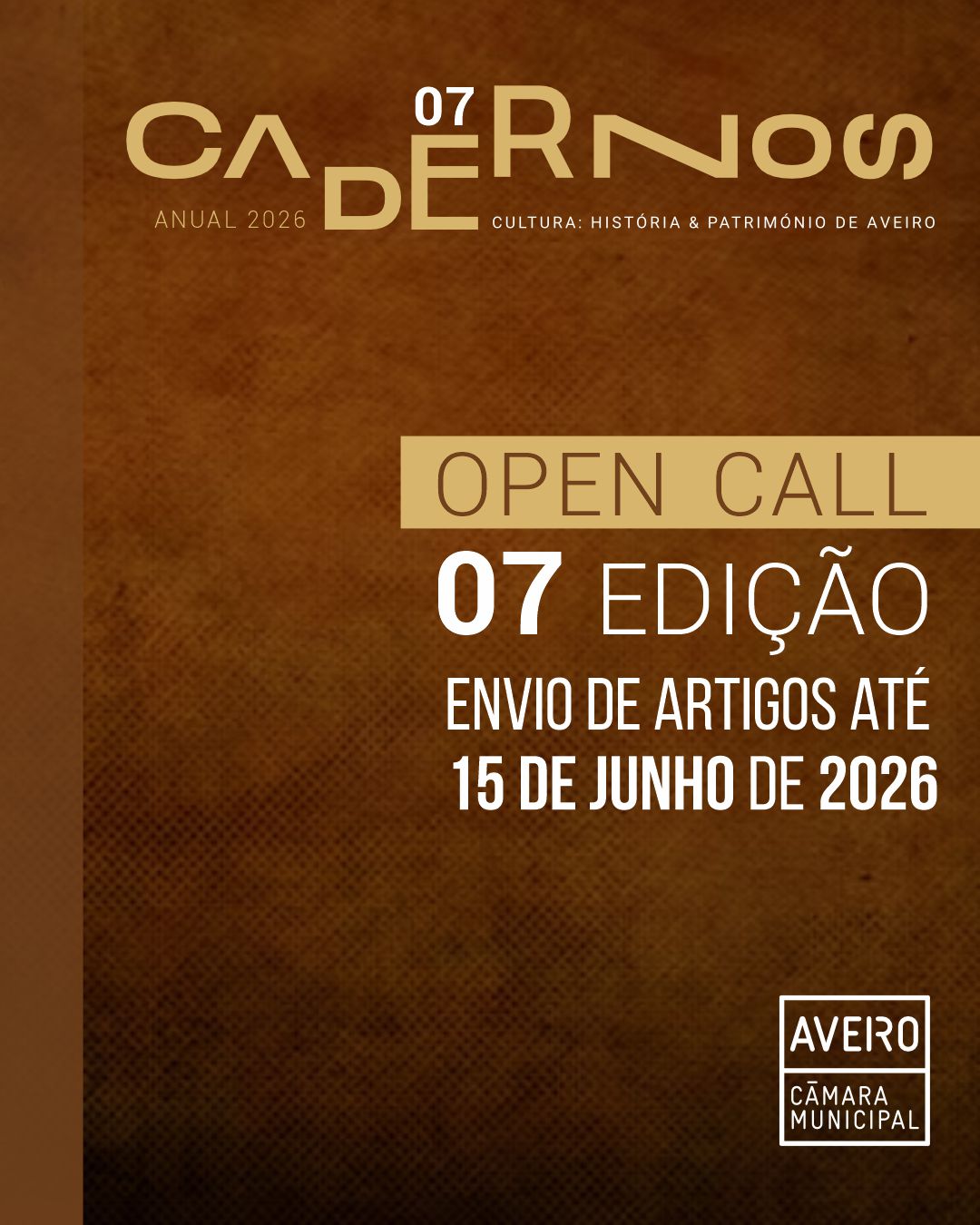 O Município de Aveiro informa que se encontra aberta a chamada para submissão de artigos científicos para o número 7 da revista Cadernos de Cultura: História & Património de Aveiro, uma publicação dedicada à investigação, reflexão e divulgação no âmbito da história, património e cultura da região.